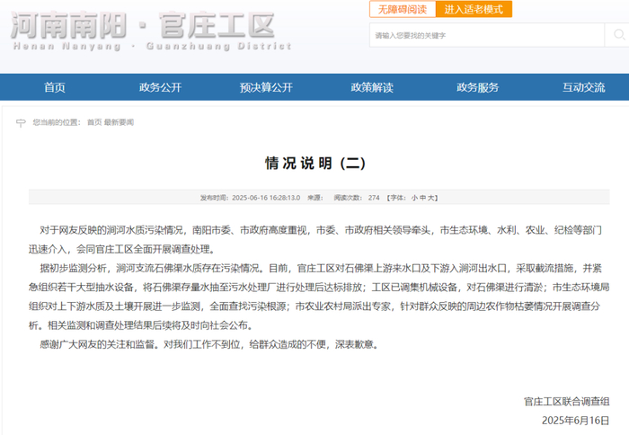 南阳官庄工区就“涧河存在水污染问题”致歉:已采取截流、清淤措施