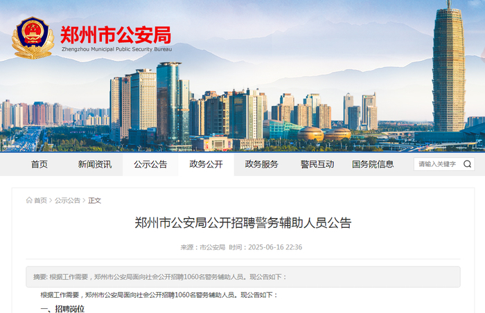 6月17日,记者从郑州市公安局了解到,根据工作需要,郑州市公安局面向社会公开招聘1060名警务辅助人员。