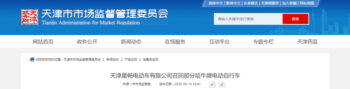 天津星畅电动车有限公司召回部分哈牛牌电动自行车
