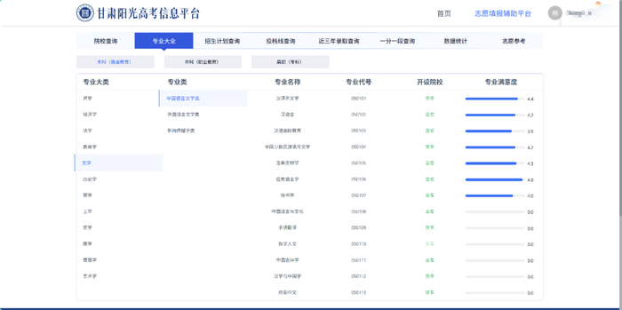 专业大全页面为考生提供本科(普通教育)、高职(专科)、本科(职业教育)层次中各类专业信息查询,可以查看专业代码、开设院校、专业解析等信息。