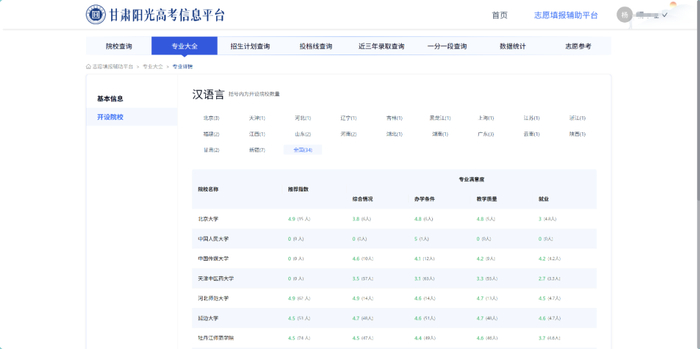 院校查询列表页面为考生提供所有在甘招生院校信息,包括院校官网、院校所在城市、主管部门、办学地址、院校满意度等。