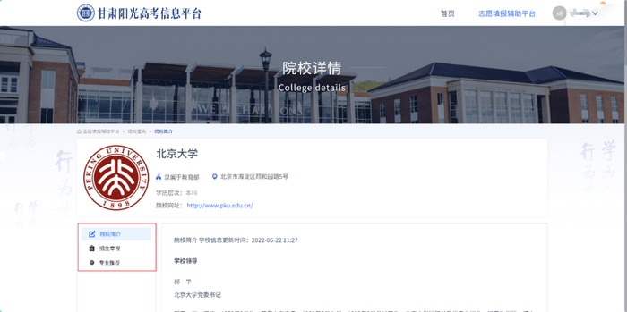 考生可以点击院校名称进入院校详情页面,院校详情包含院校简介、招生章程、专业推荐等信息。