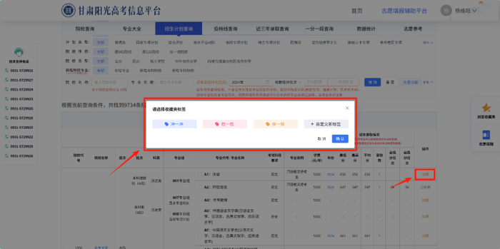 为方便对专业进行分类,收藏时需要选择不同的标签进行保存。平台默认提供“冲一冲”、“稳一稳”、“保一保”三个标签,考生也可以点击“自定义新标签”按钮创建自己的标签进行收藏,需要注意删除自定义标签会清空收藏夹中该标签下收藏的专业。
