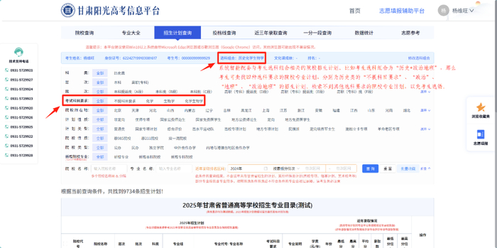 招生计划查询页面为考生提供2025年在甘招生院校在全省的招生计划信息,包含院校代号、院校名称、层次、批次、科类、专业组信息、专业名称 、考试科目要求、收费标准、学制等信息。招生计划按照“院校专业组+专业”模式分层展示,方便考生查看。考生可根据科类、层次、批次、考试科目要求、院校所在地、计划性质、计划类型、院校性质、院校类型、新增院校及专业多维度查询2025年招生计划。同时也支持输入院校名称、专业名称及最低分或最高分位次进行查询。同时智能链接往年院校、专业录取数据。