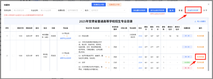 考生可以点击专业右侧操作中“收藏”按钮将专业添加到不同标签的收藏夹下,或者勾选专业选择框,点击“批量收藏”按钮进行收藏。收藏专业时系统会自动校验该专业是否与考生资格相匹配,资格不匹配时无法收藏并提示原因。