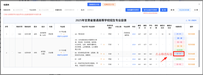 点击右侧“浏览收藏夹”按钮查看已收藏的专业内容。若考生需要修改已收藏专业的标签,可以通过点击该专业的收藏标签进行切换。