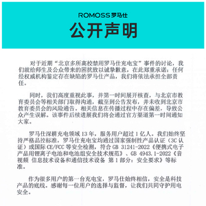 6月14日下午,ROMOSS罗马仕在官方微博上发布公开声明称,对于近期“北京多所高校禁用罗马仕充电宝”事件的讨论,公司就给师生及公众带来的困扰致以诚挚歉意,在此郑重承诺:任何经权威机构鉴定存在缺陷的罗马仕产品,公司将依法承担全部责任。