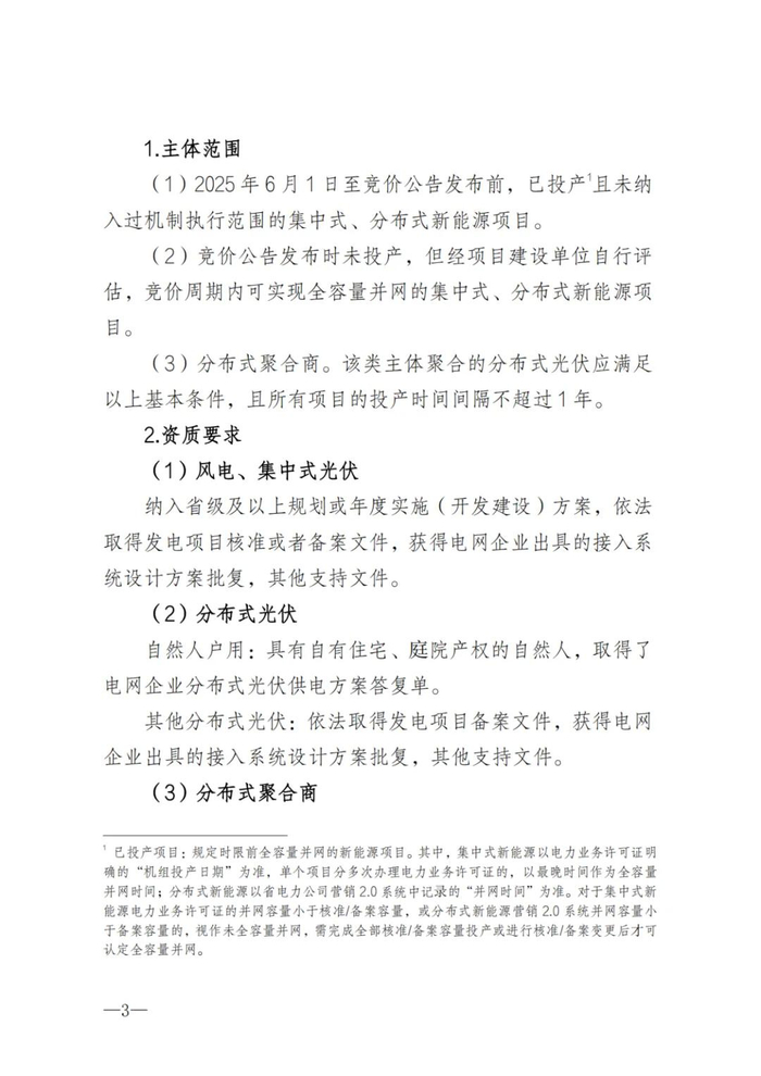 竞价范围:竞争范围,参与2025年增量机制电量竞价范围为2025年6月1日至12月31日全容量投产的新能源项目;参与2026年及以后每年增量机制电量竞价范围为已投产和未来12个月内投产且未纳入过机制执行范围的项目。