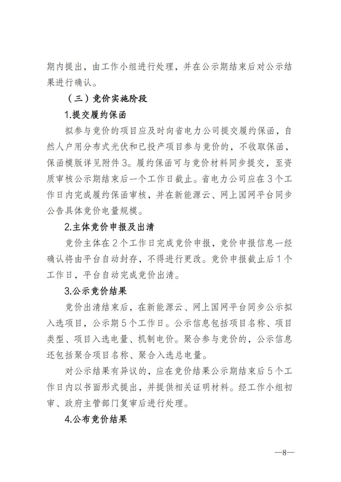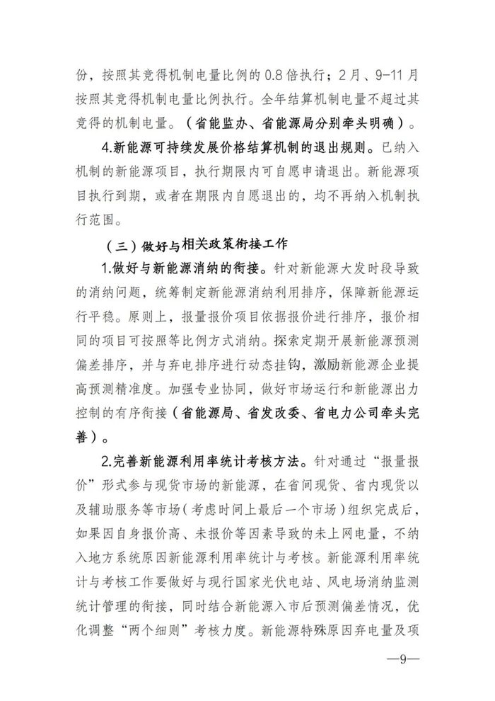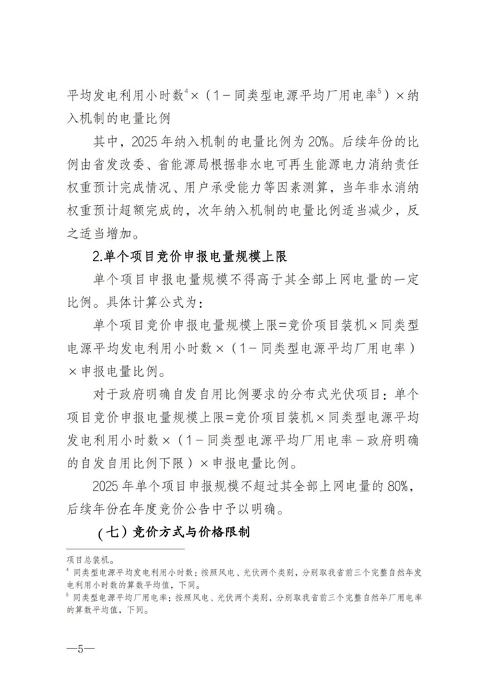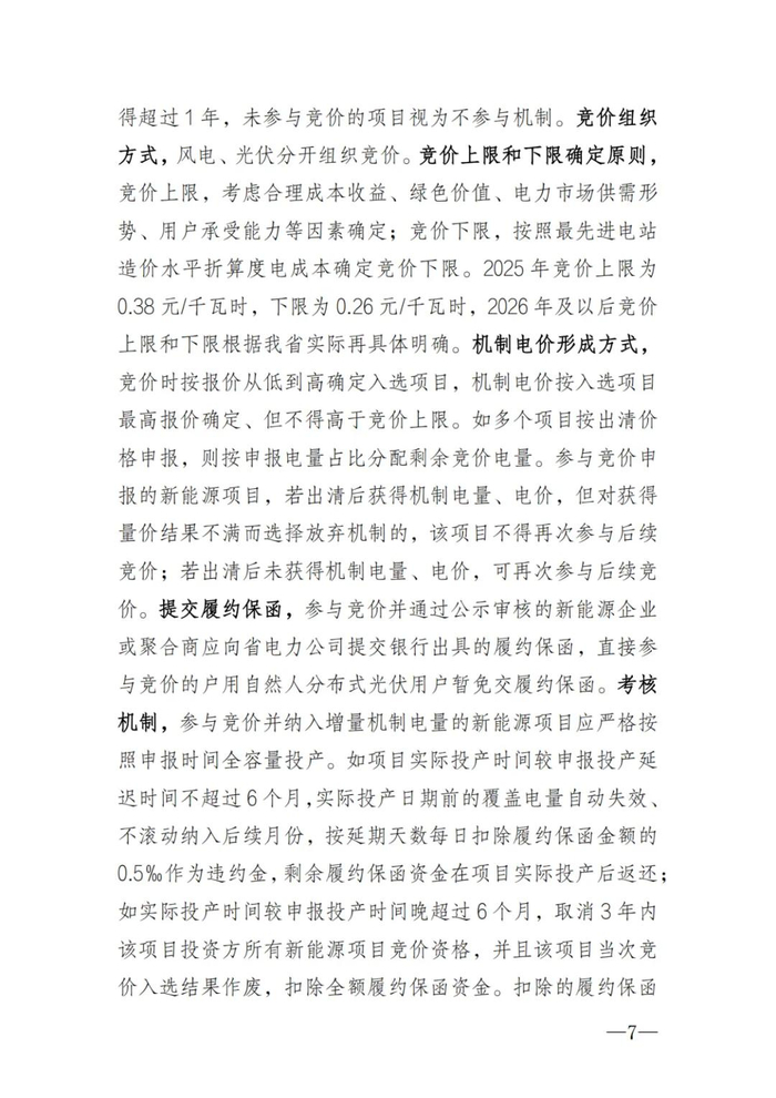 竞价方式以及机制电价:风电、光伏分开组织竞价。2025年竞价上限为0.38元/千瓦时,下限为0.26元/千瓦时,2026年及以后竞价上限和下限根据我省实际再具体明确。