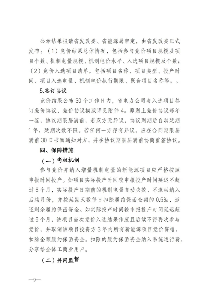 考核机制:如项目实际投产时间较申报投产延迟时间不超过6个月,实际投产日期前的覆盖电量自动失效、不滚动纳入后续月份,按延期天数每日扣除履约保函金额的0.5‰作为违约金,剩余履约保函资金在项目实际投产后返还;如项目实际投产时间较申报投产时间晚超过6个月,取消3年内该项目投资方所有新能源项目竞价资格,并且该项目当次竞价入选结果作废,扣除全额履约保函资金。扣除的履约保函资金纳入系统运行费分享给全体工商业用户。