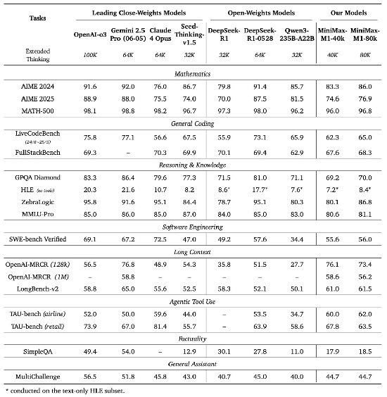 “通过全面的评估,MiniMax-M1与DeepSeek-R1和Qwen3-235B一起,跻身全球最佳开源权重模型之列。”MiniMax表示。