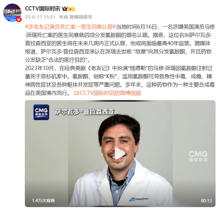 当地时间6月16日,一名涉嫌美国演员马修·派瑞死亡案的医生同意就四项分发氯胺酮的罪名认罪。据悉,这位名叫萨尔瓦多·普拉森西亚的医生将在未来几周内正式认罪,他或将面临最高40年监禁。据媒体报道,萨尔瓦多·普拉森西亚承认在派瑞去世前 “故意”向其分发氯胺酮,并且药物分发缺乏“合法的医疗目的”。