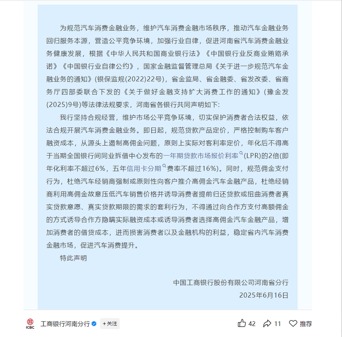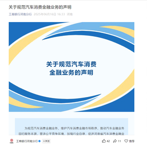 财联社记者注意到,6 月 16 日,河南省内工商银行、中国银行、建设银行、交通银行、邮储银行等国有大行,中信银行、民生银行等股份制银行河南省分行及河南农商行,均对外集体发布《关于规范汽车消费金融业务的声明》。