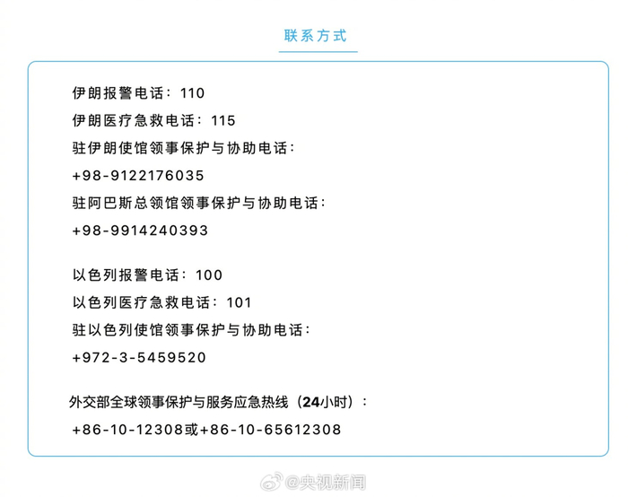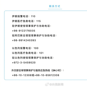 请在伊朗、以色列的中国公民联系使领馆,也可拨打12308领事保护热线。