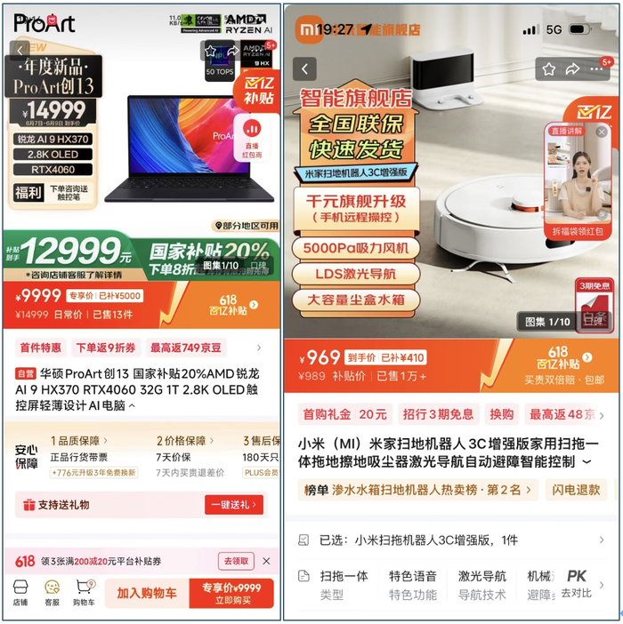 京东百亿补贴火力全开。以华硕ProArt创13笔记本为例,原价14999元,百亿补贴直降5000元,到手只要9999元。小米扫拖机器人3c增强版,京东百亿补贴也直降410元,到手价仅需969元。特别是在京东618期间,部分爆品百亿补贴低至2折。