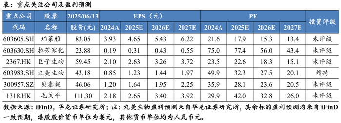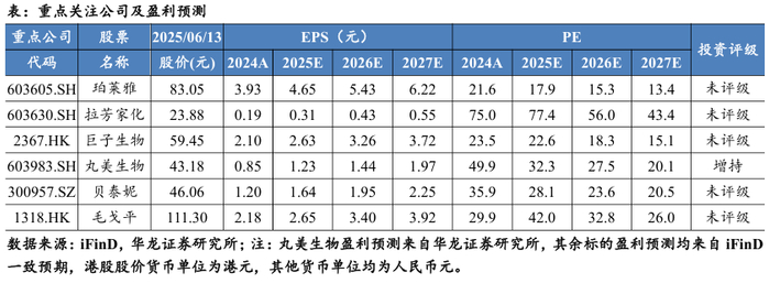 敷尔佳自主研发的“重组Ⅲ型人源化胶原蛋白贴敷料”通过伦理审查并完成临床试验备案,标志着公司在医美医疗器械领域取得重要突破,为其开拓市场、丰富产品线奠定坚实基础,看好医美行业成长空间。维持美容护理行业“推荐”评级。建议重点关注:1)凭借完善的品牌矩阵与全面的品类布局,增长势头强劲:丸美生物、珀莱雅;2)精准把握细分赛道,随着国潮与高端美妆的崛起,有望迎来快速发展:巨子生物、毛戈平;3)以高性价比为切入点,同时具备强大的产品创新力:贝泰妮、拉芳家化。