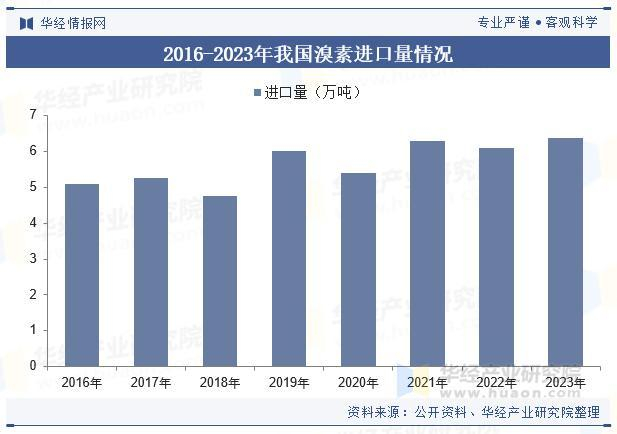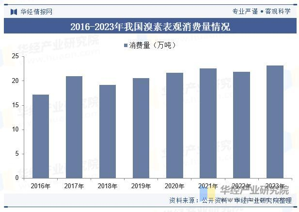 我国溴素的总消费量包括国内生产的溴素和进口的溴素。我国溴素的消费量一直处于增长的态势,2016-2023年溴素表观消费量年均增长率约4.37%。据统计,2022年消费量21.9万吨左右,2023年消费量约23.2万吨,同比增长5.9%。
