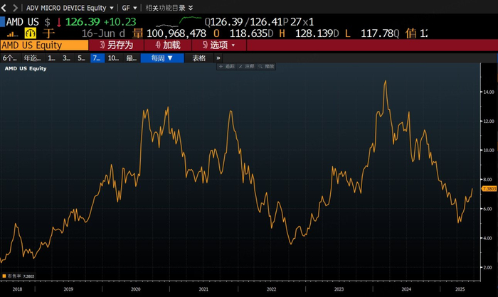 2024年二季度到今年一季度,AMD股价大幅下跌,主要是股价巨大涨幅过后,估值创下历史新高: