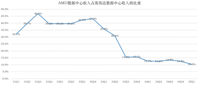 AMD的新产品虽然在性能上有大幅提升,但从数据中心的收入来看,AMD只有英伟达的十分之一,而且,自ChatGPT之后,AMD和英伟达之间的差距是拉大,而非缩小的: