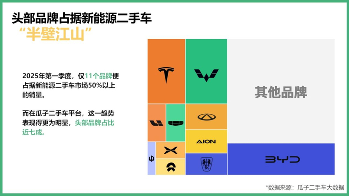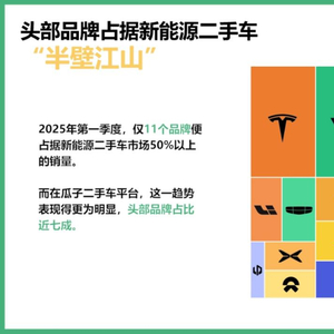乘联会秘书长崔东树发文,2025年4月国内新能源车的渗透率已达9.1%,延续高增长态势。而在新能源二手车市场,品牌的集中趋势明显:根据瓜子二手车大数据观察,从市场大盘数据看,截至2025年第一季度,仅11个品牌便占据新能源二手车市场50%以上的销量。
