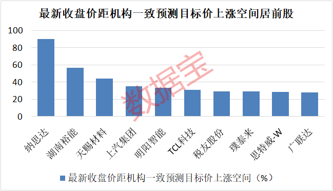 据数据宝统计,上述16只潜力股中,纳思达、湖南裕能、天赐材料、上汽集团、明阳智能、TCL科技最新收盘价距机构一致预测目标价上涨空间超30%。
