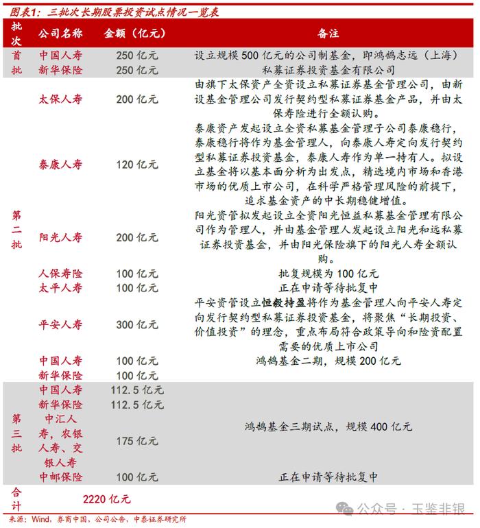 到了2025年,国家金融监管总局将这一试点扩容。太保寿险、泰康人寿、阳光人寿及相关保险资管公司在1月获准以契约制基金方式参与试点;人保寿险、中国人寿、太平人寿、新华保险、平安人寿等5家保险公司于3月初获批开展试点,这8家公司组成了超千亿规模的险资长期投资试点二期名单,其中也包括鸿鹄二期基金。5月,第三批试点陆续获批,规模合计600亿元。中泰证券非银金融首席分析师葛玉翔在研报中表示,除了上述的鸿鹄三期之外,亦有中邮保险、交银人寿等多家银保系中小公司参与试点。