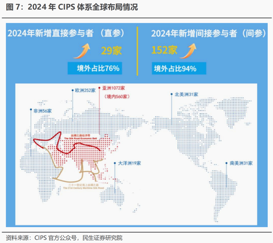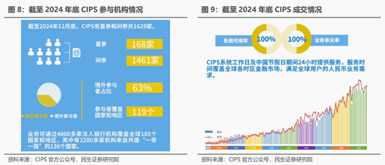 CIPS系统持续建设,成交额不断攀升。中国跨境支付系统(CIPS)近两年发展迅猛,成为人民币国际化的重要引擎。2024年,CIPS累计处理跨境人民币支付业务金额达175万亿元,同比增长43%,较2022年的业务量与金额复合增长率分别达35%和30%。截至2024年底,CIPS参与者数量持续扩大,直接参与者(直参)增至168家,间接参与者(间参)达1461家,覆盖全球119个国家和地区,其中外资银行占比85%,业务网络通过4800多家法人银行机构延伸至185个国家和地区,尤其在“一带一路”共建国家的机构占比超95%。