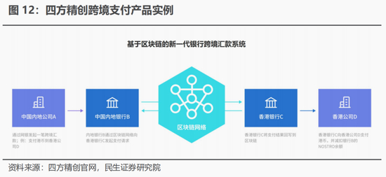 跨境支付产业链:CIPS系统建设。跨境支付体系需要持续的系统建设和迭代升级,以满足日益攀升的成交额,目前系统建设主要涵盖银行内部以及中外银行之间的连接,主要参与方是银行IT厂商,例如四方精创基于区块链打造的新一代银行跨境汇款系统。