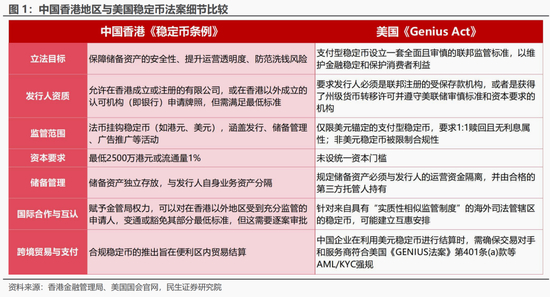 中国香港与美国在稳定币领域迈出关键步伐。中国香港《稳定币法例》与美国《Genius法案》的共性之处在于:均强制要求100%高质量、高流动性储备覆盖,禁止高风险稳定币形式,强调储备独立托管与风控等。同时,两地法案的出台都为Web3行业、稳定币市场和跨境支付等行业领域带来机遇与挑战。然而,两地法案的核心差异在于:1)监管架构方面:香港由金管局统一发牌,资本门槛2,500万港元,而美国则实行分级监管;2)储备资产方面:香港允许多币种锚定,包含港元、美元,黄金储备需特批,美国明确禁止非美元稳定币主导;3)禁止行为方面:香港法案实质上禁止了无抵押的算法稳定币,美国禁止发行没有足额储备的算法稳定币等。