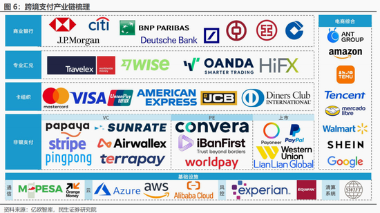 全球跨境支付产业链梳理:传统跨境支付体系涵盖多种金融机构。目前传统的跨境支付体系涵盖从底层基础设施、中间多个场景跨境支付服务商、上层包括跨境电商在内的海量支付场景。