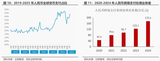 人民币国际化稳步推进。近年来随着CIPS生态建持续推进,人民币在跨境支付当中的使用量以及市场份额保持上升态势。根据亿欧智库的数据,回顾2019-2025年4月人民币在跨境支付当中份额变化,在2023年人民币份额持续提升,已经超过4%;从实际处理量来看,2024年人民币跨境支付处理业务量已经达到175.5万亿元,2020-2024年CAGR达到40%。