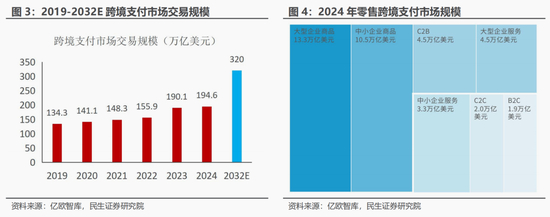 全球跨境支付金额稳健增长,稳定币落地空间广阔。根据亿欧智库数据,2024年全球跨境支付交易额达到194.6万亿美元,相较于2023年保持平稳增长,而预计到2032年全球跨境支付交易额有望保持6.4%的CAGR成长至320万亿美元。具体到零售场景,2024年整体零售跨境支付交易额为39.9万亿美元,其中主要以大型、中小型企业商品贸易为主。考虑到稳定币在跨境支付场景中的便捷性,后续在跨境支付中使用稳定币替代传统跨境支付的趋势或将持续推进,而相较于当前近2500亿美元的稳定币市值,跨境支付中接近200万亿美元的交易量对于稳定币的需求量仍有显著的增长空间。