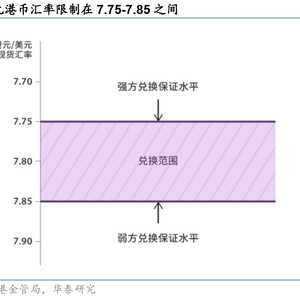 香港实施联系汇率制度,对美汇率限制在7.75-7.85区间。在联系汇率制度下,港元货币基础得到100%美元资产的支持。当港元汇率走强触及7.75港元/美元,就达到了所谓的强方兑换保证水平。此时香港金管局承诺以7.75港元/美元向银行卖出港元。反之当汇率触及7.85港元/美元,就到了弱方兑换保证水平,金管局则会承诺以相应价格买入港元。