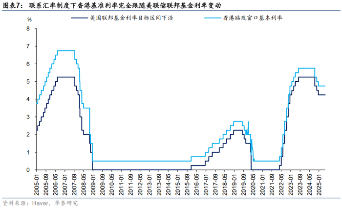 1)联系汇率制度下香港没有独立的货币政策,其基准利率完全跟随美联储联邦基金利率变动。香港基准利率即贴现窗口基本利率是美国联邦基金利率目标区间下限加50个基点,或隔夜及1个月香港HIBOR利率的5天移动平均数的平均值,以较高者为准。