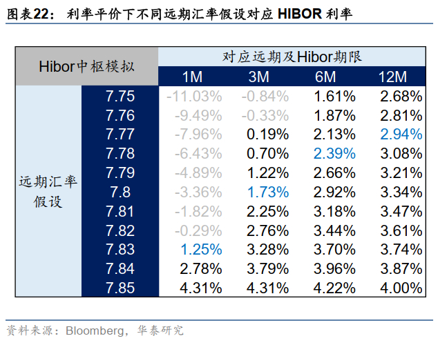 未来的HIBOR利率更多是从极低水平向上调整,最终点位可能依然处于中低区间。中长期来看,港美利率高度相关,理应联动变化。但港元利率回升的速度和幅度具有不确定性。若仅考虑套息交易这一股力量:1)假设远期合约对冲汇率风险,HIBOR利率几乎都没有套息空间;2)假设裸套息承担汇率风险,保持美元利率不变,我们以利率平价理论反推不同远期汇率条件下套息收益为0的HIBOR利率点位,得到以下模拟假设表(图表22)。若因金管局操作未来1/3个月港币中枢来到7.83/7.80(也即目前远期合约点位),对应的1M、3M HIBOR应为1.25%、1.73%,较目前水平提升不明显。汇率升值压力越大,套息交易损失越多。更何况目前香港资本流动中还有一股重要力量,也即参与一二级资本市场的资金南向和海外资金创造了港元需求,部分对冲港元套息交易抛压。因此总体来看,香港流动性中期依然充裕。