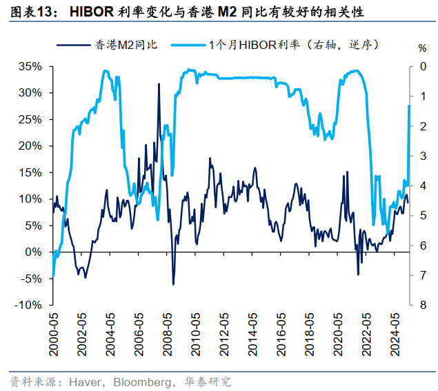1)香港经济景气度上升。香港经济动力来源于金融服务、旅游、贸易及物流、专业及其他工商业支援服务。融资成本的走低有助于刺激信贷周期,从而激发香港经济活力。从数据看,HIBOR利率变化与香港M2同比有较好的相关性,且香港M2增速与香港实际GDP增长高度相关。