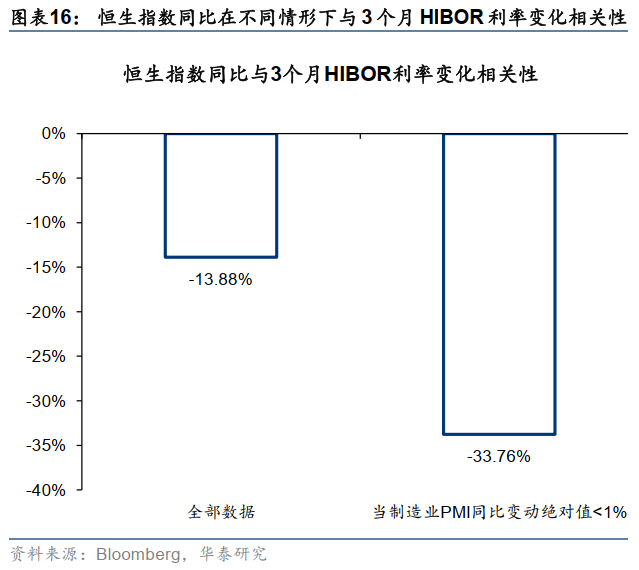 香港本地利率变化的效果更多体现在以下几点:1)香港经济主要动力来自金融服务,绝大多数银行贷款挂钩HIBOR(H按),融资成本降低有助于刺激信贷周期,激发经济活力。2)保证金交易(孖展)借贷费用一般也挂钩HIBOR。当中国内地经济变化不大时,利率变化对股票市场的作用更明显,控制PMI变化范围为-1%~1%,HIBOR与恒指相关性提升至-34%。3)板块上,香港利率变化对香港本地股影响相对更大。
