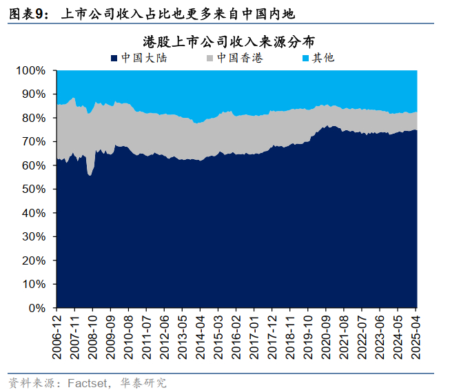 本地金融条件变化影响香港经济和资本市场,但这个因素是边际的。香港经济和市场的核心影响因素还是中国内地的经济基本面。香港GDP增速与中国内地相关性超过60%,2020年以来港股上市公司的中国内地收入占比超过70%。恒指同比增速与中国制造业PMI同比相关性高达56%,但与3个月HIBOR及美债利率变动相关性分别只有-14%和12%。