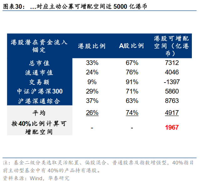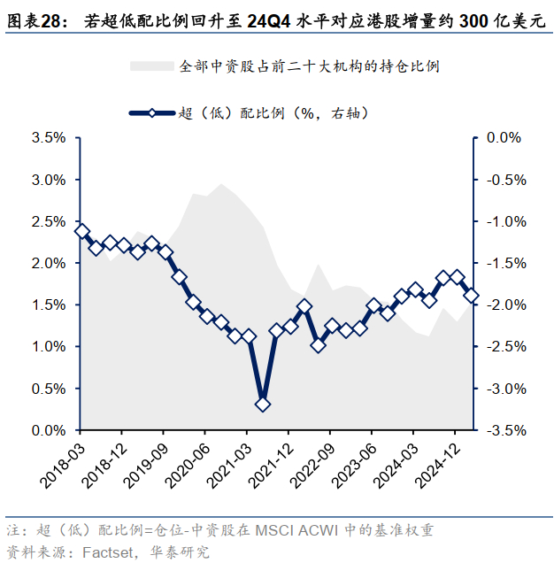 3)外部资金流入香港动能仍强。参考我们在2025.6.3《海外市场2H25展望:再平衡进行时》中的测算,外资方面,全球前20大投资机构1Q25对中资股仓位有所上升,但因不及市场涨幅导致欠配程度被动提升。若超低配比例回升至24Q4水平,即对中资股持股再提升0.22pct,对应全球前20大投资机构对港存在300亿美元的持仓提升空间。南向方面,经测算下合理投资比例占到26%附近,当前40%已经配置港股的公募增配可以带来2000亿港币左右增量。若目前主动偏股公募均按比例配置,或带来5000亿港币左右增量资金。