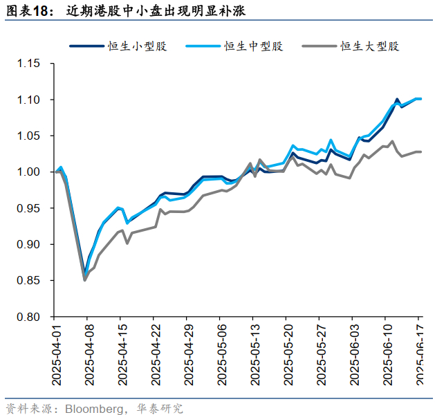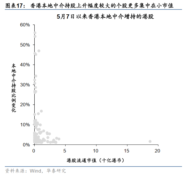 本轮利率走低过程中,我们发现香港本地中介持股上升幅度较大的个股更多集中在小市值,港股通公司数量较少。且整个香港市场风格上,小盘股出现明显的补涨。由于内地资金更多通过港股通购买港股(大盘风格),且外资也更偏好大市值公司,因此上述变化或反映出本地资金在流动性改善后的风险偏好提振。