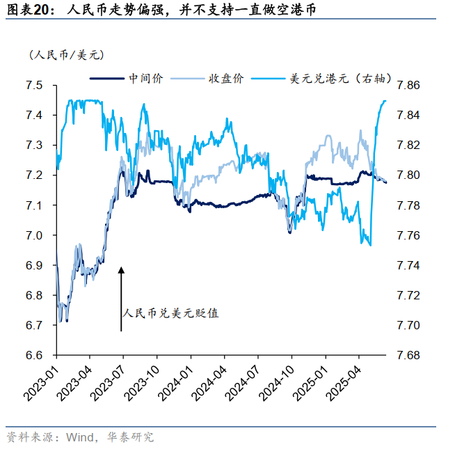 汇率没有持续冲击弱方保证的基本面压力,因此不太可能造成流动性的大规模收紧。人民币等亚洲货币被低估是题中之义,当前情况完全不是此前人民币有贬值压力时的港币弱势。年初至今,相比其他亚洲货币表现,人民币的升值补涨尚不充分。无论从基本面维度,还是从货币错配的幅度(再平衡压力)而言,我们认为人民币都不宜相对主要贸易伙伴深度调整,甚至可能出现升值动力。目前人民币汇率已经从中间价上下2%区间的弱势位置回到中间价水平,多空力量较为均衡,不再是单边贬值压力。这个基本面环境并不支持一直做空港币。