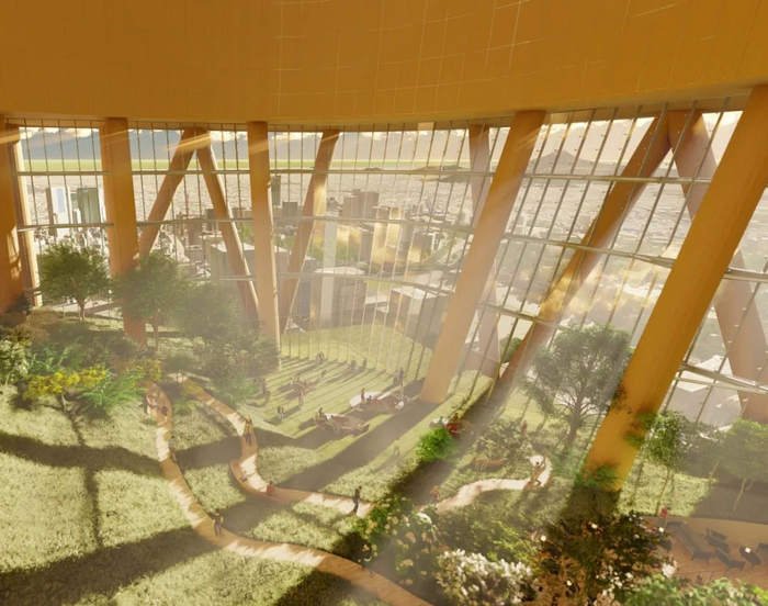 “火炬塔”在设计中还融入了浓厚的文化元素。建筑外观以“火炬”为灵感,顶部的酒店大堂层采用赤铜色,象征日本传统建筑中铜的温暖光泽。低层部分由建筑师永山祐子操刀,设计了约2公里的“空中散步道”,连接1至8层,让行人能在立体空间中体验城市活力。屋顶的“SKY HILL”半室外空间则由藤本壮介设计,宛如一座悬浮的空中花园。这些设计不仅展现了日本建筑美学的精髓,也让“火炬塔”成为一座有温度的建筑。