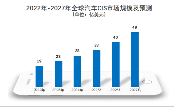 随着智能驾驶渗透率提升,预计2022-2027年,全球汽车CIS市场规模将从19亿美元增长至49亿美元,年复合增长率高达20.6%。