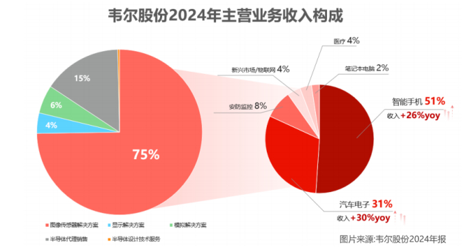 目前,CIS业务是公司最大收入来源,2024年营收占比约75%,半导体代理销售业务营收占比约在15%。进一步看,CIS业务创造的191.1亿收入中,三成来自汽车电子,五成来自智能手机。