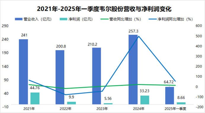 当年韦尔股份实现营收257.3亿元,同比增长22.41%;实现净利润33.23亿元,同比大增498.11%,成功穿越半导体下行周期。