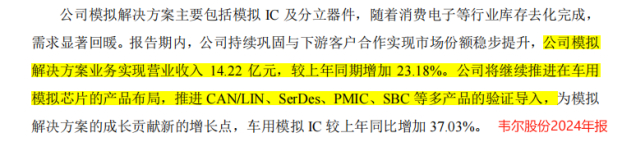 公司已经布局模拟IC及分立器件,2024年实现14.22亿元营收,同比增速超20%。受CAN/LIN、SerDes、PMIC等产品驱动,车用模拟IC增长更快,同比增速高达37.03%,