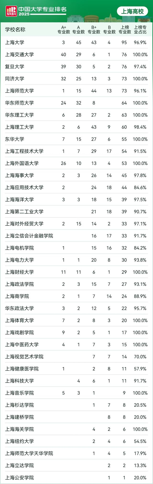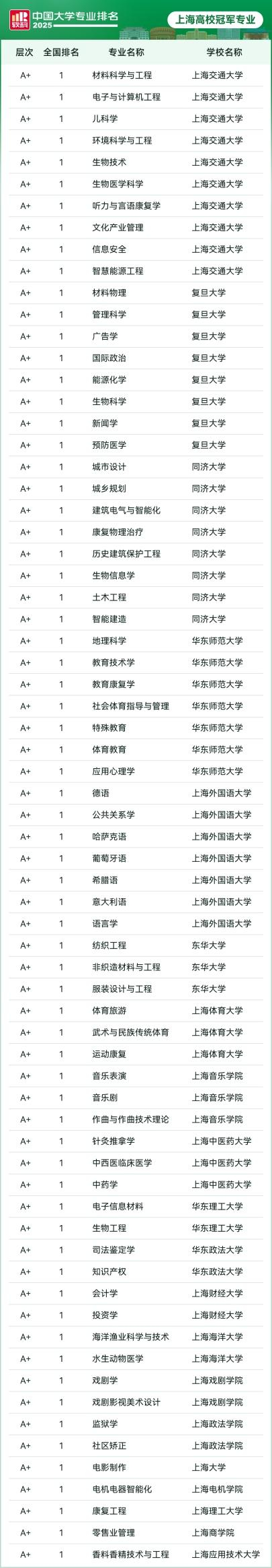 原标题:《中国大学专业排名新发布:上海这69个专业拿全国头名,A+专业数量全国第二》