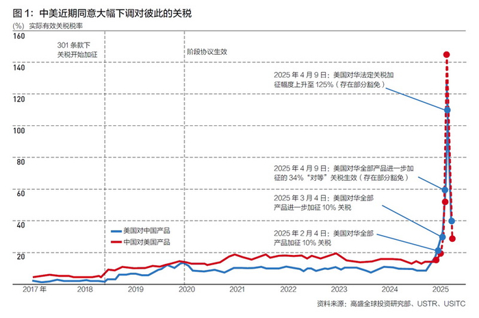 5月12日,中美两国在日内瓦举行贸易谈判后发表联合声明,同意缓和贸易紧张局势,并就经贸关系展开持续对话。具体而言,美国将取消此前几轮对中国的报复性关税,并在5月14日起的90天时间内暂停加征34%“对等”关税中24%的部分,但维持加征剩余10%的关税。