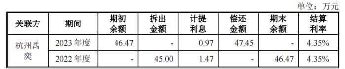 2022年4月,公司曾拆借资金45万元给杭州禹奕,再由杭州禹奕拆借给成都莲洲科技有限公司。成都莲洲科技有限公司系公司客户,其因临时资金短缺,出于长期合作考虑,公司拆借上述款项用于其日常经营。该款项及对应利息已于2023年7月足额归还。