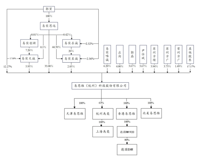 递表前,郭寅直接持有公司12.27%股份,通过实际控制易实思远、易实天诚、易实至诚分别间接控制公司35.08%、5.95%、2.83%股份,合计控制公司56.13%股份。